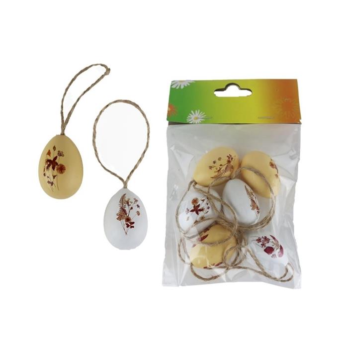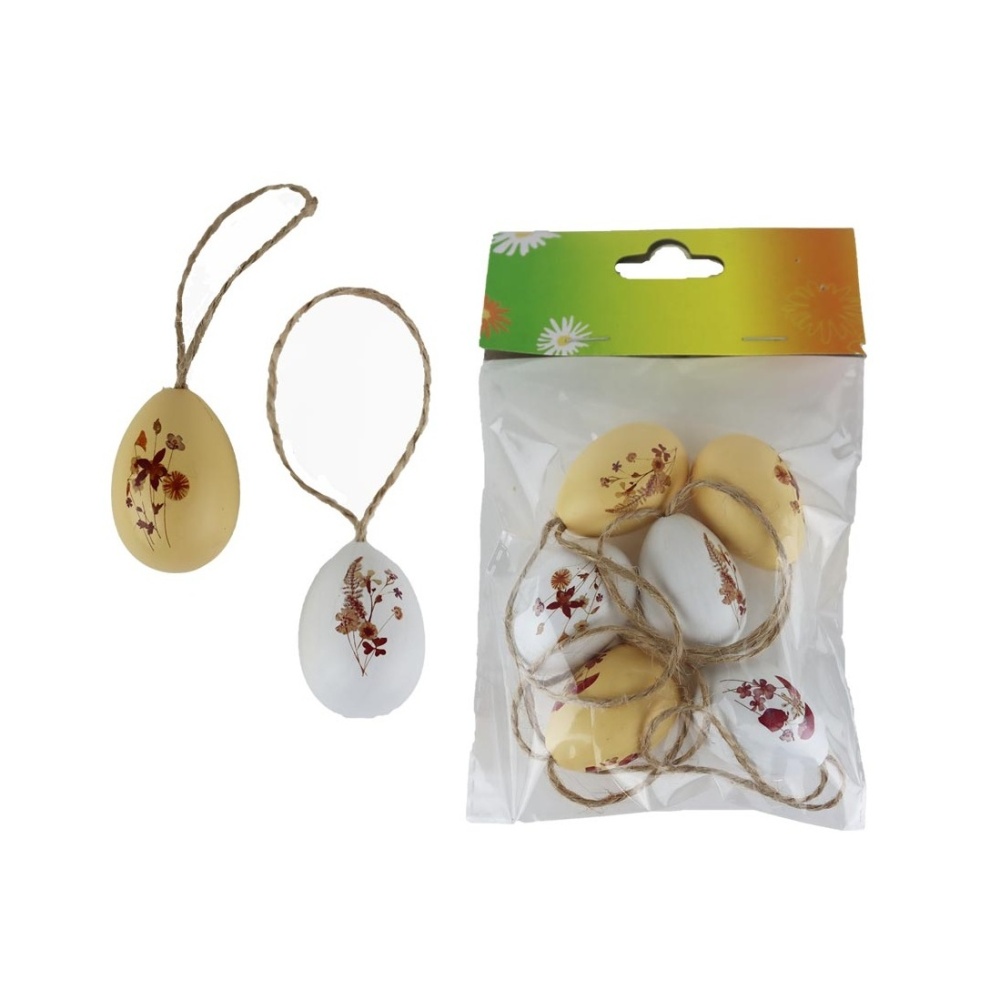 Ozdoba plastové vejce s květy, bílá/žlutá, mix, 6 ks je sada závěsných dekorací vhodných pro jarní a velikonoční aranžmá. Každé vejce je zdobeno jemnými plastovými květy, které dodávají dekoraci hravý a veselý vzhled.