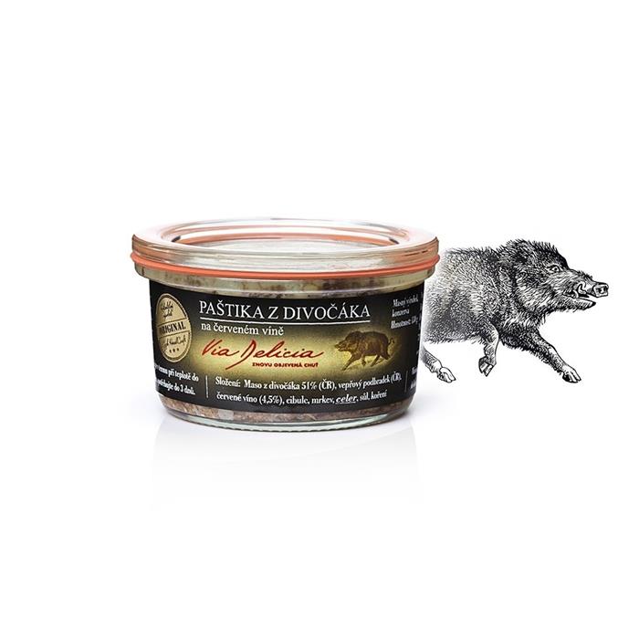Složení:  maso z divočáka 51%, vepřové maso, červené víno 4,5%, cibule, mrkev, celer, sůl, kořen