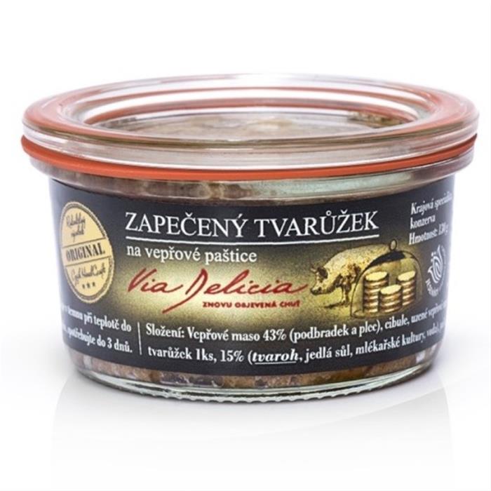 Originální kombinace lahůdkové paštiky a Olomouckých tvarůžků. Dobře uzrálý tvarůžek jsme položili na paštičku a zapekli přímo ve skleničce. V každé skleničce je skutečně jeden celý tvarůžek, který dodává výrobku nezaměnitelnou, typickou chuť. Krajová specialita, konzerva.