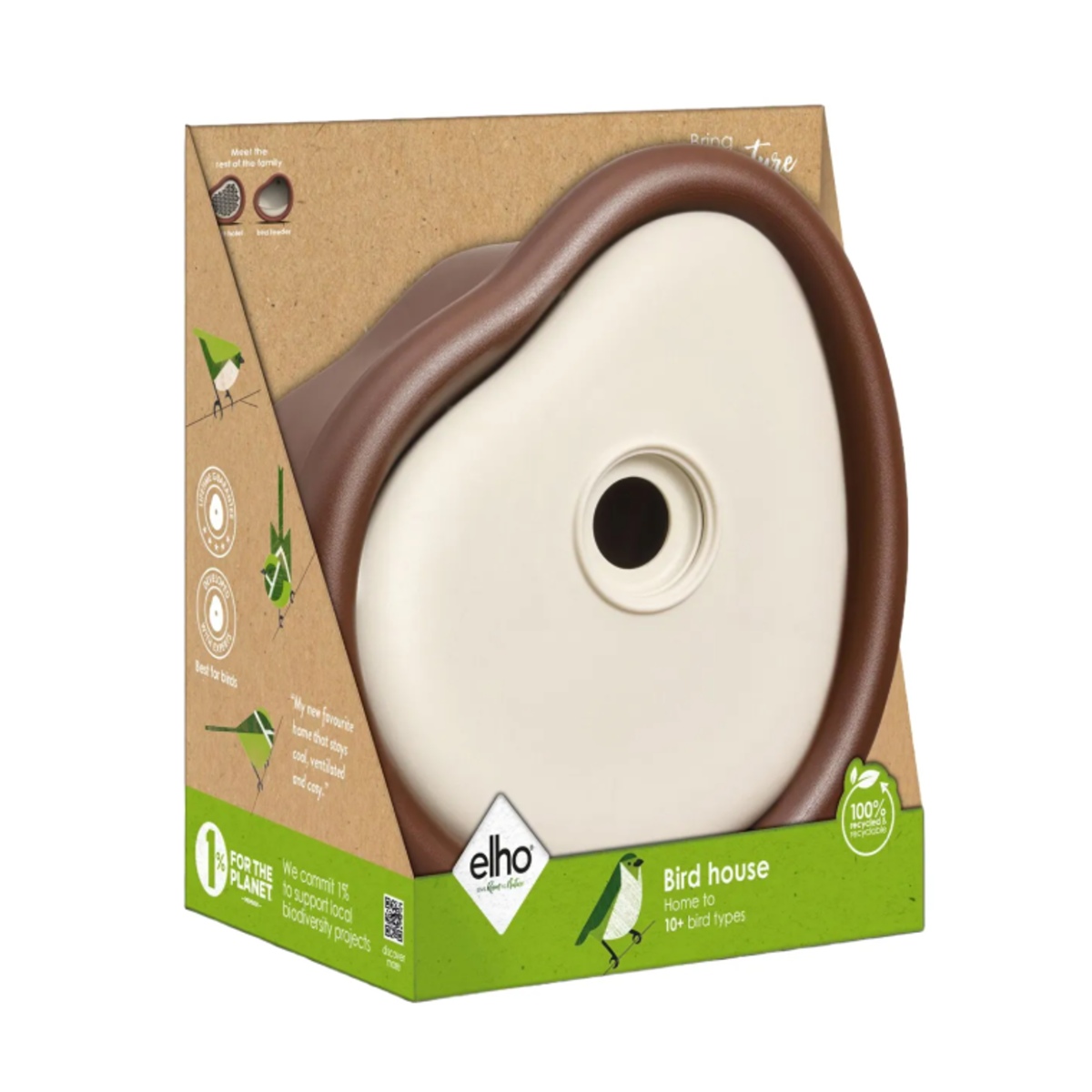 Přibližte se přírodě s ptačí budkou organic Elho. Její design nabízí příjemné místo k úkrytu a hnízdění, které do vaší zahrady přiláká více než 11 různých běžných druhů ptáků, včetně vrabců a sýkorek. Odvodňovací a větrací otvory zajišťují zdravé a pohodlné prostředí uvnitř, zatímco odnímatelné vnitřní části usnadňují a zrychlují čištění. Tato ptačí budka byla vyvinuta ve spolupráci s odborníky a poskytuje zahradním ptákům bezpečný a pohodlný úkryt. Velikost vchodu ptačí budky můžete změnit a přizpůsobit tak, aby poskytovala správnou ochranu pro různé druhy. Všestranné možnosti montáže vám umožňují snadno zavěsit ptačí budku na zeď, strom nebo plot a okamžitě vytvořit místo vhodné pro ptáky ve vaší zahradě nebo na balkoně. Ptačí budka organic je vyrobena ze 100% recyklovaného plastu a vyrábí se s využitím větrné energie.