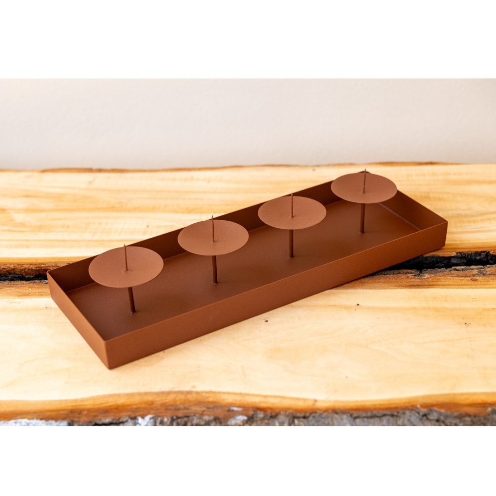 Kový svícen pro sváteční dekoraci. Úprava materiálu: před lakováním povrchu probíhá tryskání ocelových broků a automatické odmaštění/fosfátování, poté lakování v práškové lakovně a následně vypalování při cca 200 °C po dobu cca 20 minut. Výsledkem je hladká, antikorozní barva a celoroční užívání na zahradě.