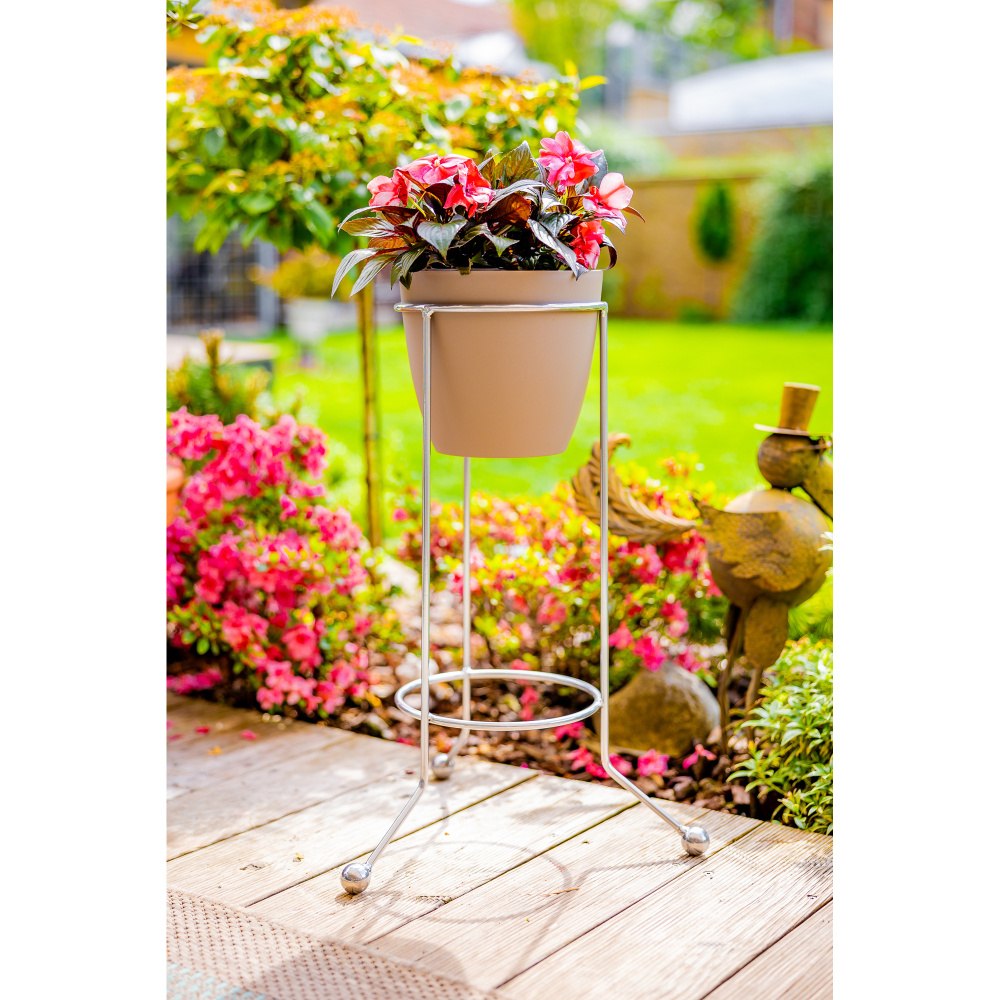 Kovový stojan na květiny, který udělá parádu u vchodu i na terase. Úprava materiálu: před lakováním povrchu probíhá tryskání ocelových broků a automatické odmaštění/fosfátování, poté lakování v práškové lakovně a následně vypalování při cca 200 °C po dobu cca 20 minut. Výsledkem je hladká, antikorozní barva a celoroční užívání na zahradě.