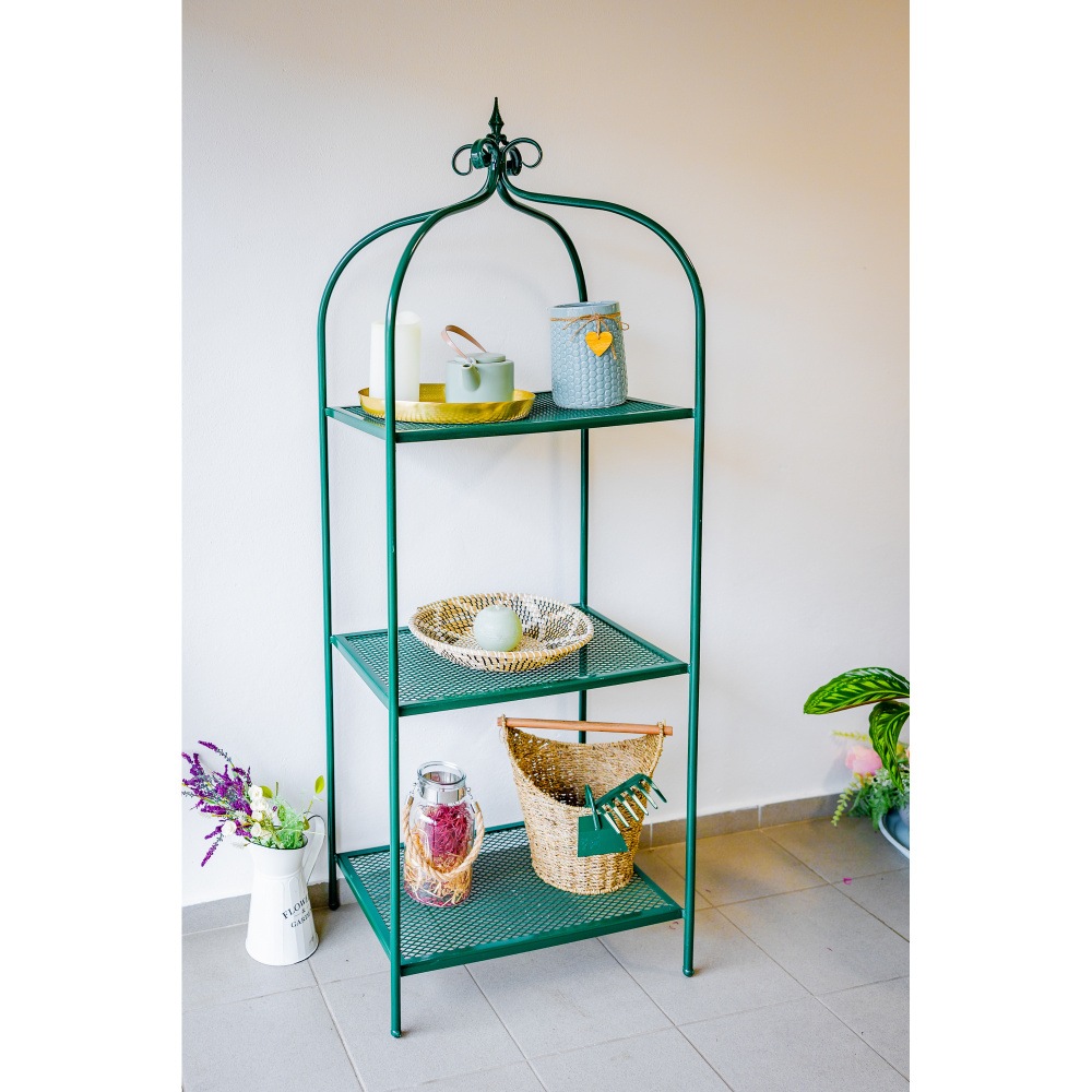 Pevný kovový regál pro rostliny odolný korozi a změnám počasí. Nahoře je zakončen ozdobnou špičkou. Úprava materiálu: před lakováním povrchu probíhá tryskání ocelových broků a automatické odmaštění/fosfátování, poté lakování v práškové lakovně a následně vypalování při cca 200 °C po dobu cca 20 minut. Výsledkem je hladká, antikorozní barva a celoroční užívání na zahradě.