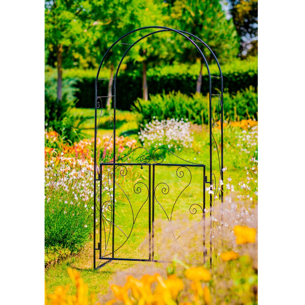 Pevná kovová opora ve tvaru loubí s brankou vhodná pro pnoucí rostliny a odolná korozi a změnám počasí.