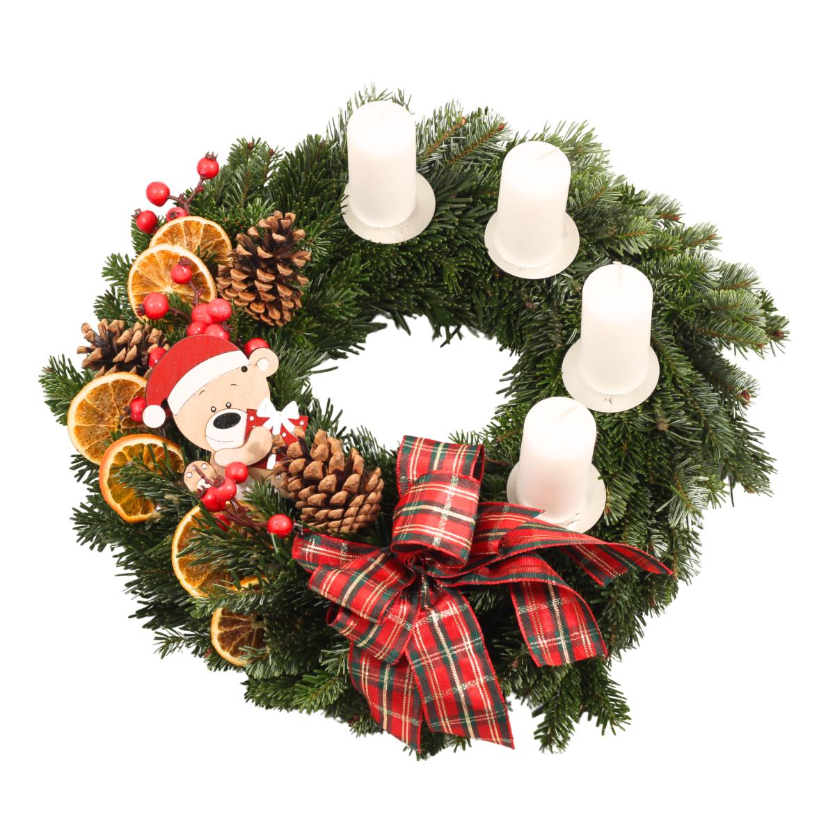 Adventní věnec je bezesporu nejoblíbenějším vánočním symbolem. Slouží především k odpočítávání čtyř týdnů adventu. Kruh vyjadřuje společenství a rodinu a plameny svíček znamenají světlo, které osvěcuje každého člověka. Věnec vyniká nejen svým vkusným provedením, ale i pečlivou přípravou materiálu a profesionální prací s materiálem. Stačí ho už jen položit na váš stůl, který bude zdobit po celý adventní čas.